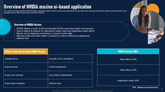 This slide showcases overview of NVIDIA Maxine application that can help to improve user experience through audio, video and augmented reality software development kit. It also highlights various effects achieved through NVIDIA Maxine. Crafting an eye catching presentation has never been more straightforward. Let your presentation shine with this tasteful yet straightforward Overview Of NVIDIA Maxine NVIDIA AI To Improve Virtual Communication Experience Mockup Pdf template. It offers a minimalistic and classy look that is great for making a statement. The colors have been employed intelligently to add a bit of playfulness while still remaining professional. Construct the ideal Overview Of NVIDIA Maxine NVIDIA AI To Improve Virtual Communication Experience Mockup Pdf that effortlessly grabs the attention of your audience Begin now and be certain to wow your customers This slide showcases overview of NVIDIA Maxine application that can help to improve user experience through audio, video and augmented reality software development kit. It also highlights various effects achieved through NVIDIA Maxine.