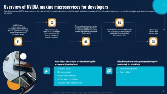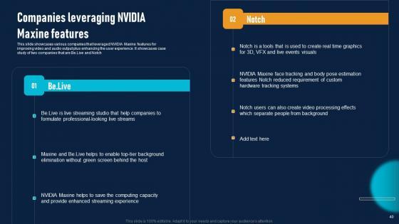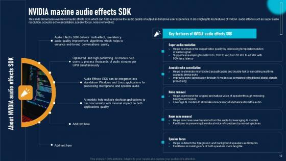 Conduct adequate research on all facets of your business and grow its in sales,profit,etc using this ready made PPT slide. This NVIDIA AI To Improve Virtual Communication Experience Ppt Powerpoint Presentation Complete Deck displays parameters to help you evaluate business environment from all angles. Incorporate this organized PPT Design in fourty eight slides to classify your top challengers. It is a customizable slide,so use it as per your requirement. Download now to showcase your expertise in all things business,and the specialized knowledge you may have. Our NVIDIA AI To Improve Virtual Communication Experience Ppt Powerpoint Presentation Complete Deck are topically designed to provide an attractive backdrop to any subject. Use them to look like a presentation pro.