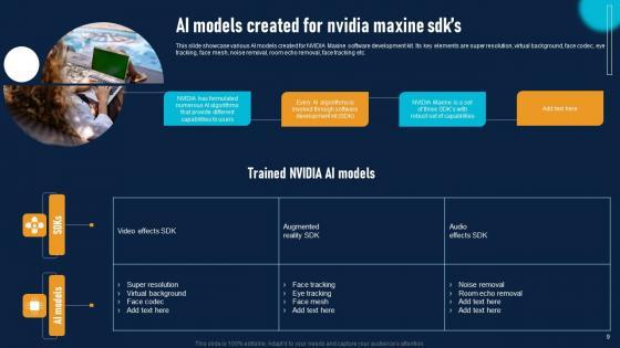 This slide showcase various AI models created for NVIDIA Maxine software development kit. Its key elements are super resolution, virtual background, face codec, eye tracking, face mesh, noise removal, room echo removal, face tracking etc. The AI Models Created For NVIDIA AI To Improve Virtual Communication Experience Information Pdf is a compilation of the most recent design trends as a series of slides. It is suitable for any subject or industry presentation, containing attractive visuals and photo spots for businesses to clearly express their messages. This template contains a variety of slides for the user to input data, such as structures to contrast two elements, bullet points, and slides for written information. Slidegeeks is prepared to create an impression. This slide showcase various AI models created for NVIDIA Maxine software development kit. Its key elements are super resolution, virtual background, face codec, eye tracking, face mesh, noise removal, room echo removal, face tracking etc.