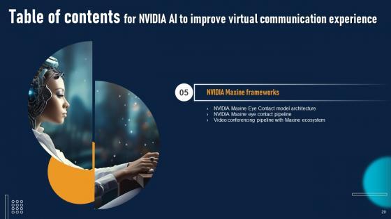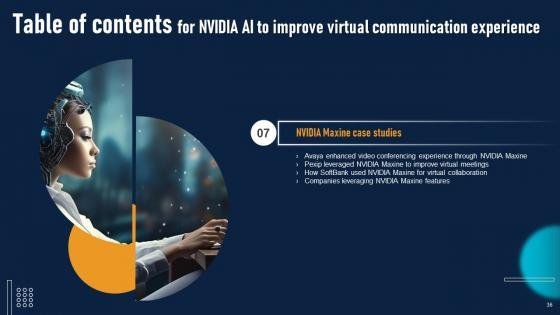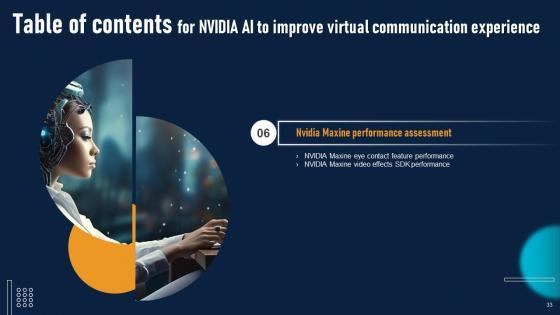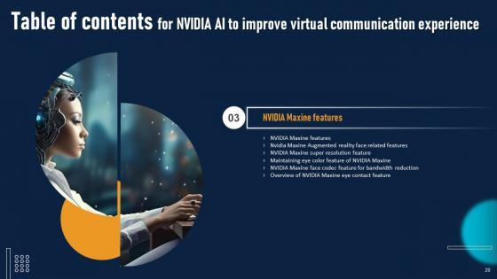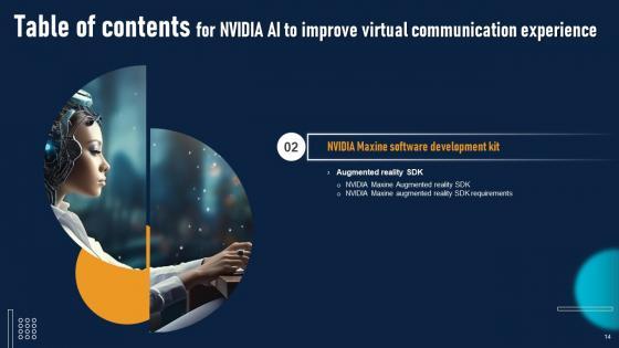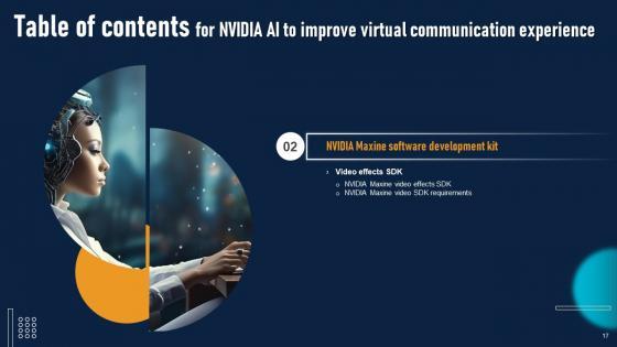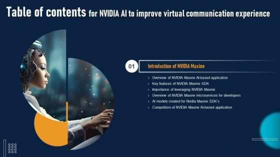 Formulating a presentation can take up a lot of effort and time, so the content and message should always be the primary focus. The visuals of the PowerPoint can enhance the presenters message, so our Table Of Contents NVIDIA AI To Improve Virtual Communication Experience Template Pdf was created to help save time. Instead of worrying about the design, the presenter can concentrate on the message while our designers work on creating the ideal templates for whatever situation is needed. Slidegeeks has experts for everything from amazing designs to valuable content, we have put everything into Table Of Contents NVIDIA AI To Improve Virtual Communication Experience Template Pdf Our Table Of Contents NVIDIA AI To Improve Virtual Communication Experience Template Pdf are topically designed to provide an attractive backdrop to any subject. Use them to look like a presentation pro.