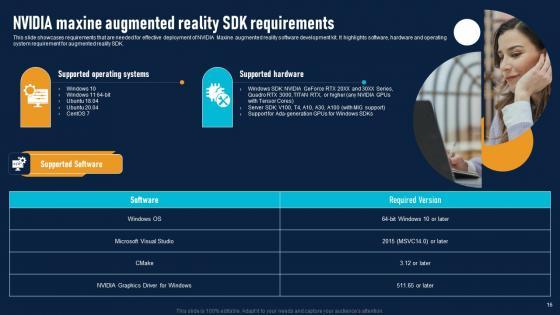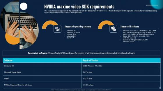 This slide showcases requirements that are needed for effective deployment of NVIDIA video software development kit. It highlights software, hardware and operating system requirement for video software development kit. Are you in need of a template that can accommodate all of your creative concepts This one is crafted professionally and can be altered to fit any style. Use it with Google Slides or PowerPoint. Include striking photographs, symbols, depictions, and other visuals. Fill, move around, or remove text boxes as desired. Test out color palettes and font mixtures. Edit and save your work, or work with colleagues. Download NVIDIA Maxine Video SDK NVIDIA AI To Improve Virtual Communication Experience Rules Pdf and observe how to make your presentation outstanding. Give an impeccable presentation to your group and make your presentation unforgettable. This slide showcases requirements that are needed for effective deployment of NVIDIA video software development kit. It highlights software, hardware and operating system requirement for video software development kit.