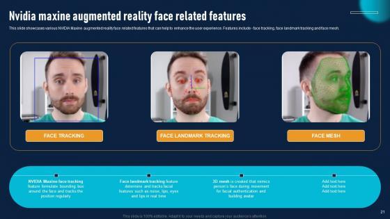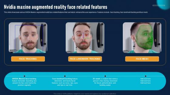 This slide showcases various NVIDIA Maxine augmented reality face related features that can help to enhance the user experience. Features include face tracking, face landmark tracking and face mesh. Get a simple yet stunning designed NVIDIA Maxine Augmented Reality NVIDIA AI Improve Virtual Communication Experience Graphics Pdf. It is the best one to establish the tone in your meetings. It is an excellent way to make your presentations highly effective. So, download this PPT today from Slidegeeks and see the positive impacts. Our easy to edit NVIDIA Maxine Augmented Reality NVIDIA AI Improve Virtual Communication Experience Graphics Pdf can be your go to option for all upcoming conferences and meetings. So, what are you waiting for Grab this template today. This slide showcases various NVIDIA Maxine augmented reality face related features that can help to enhance the user experience. Features include face tracking, face landmark tracking and face mesh.