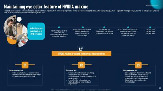This slide showcases eye color maintenance feature of NVIDIA Maxine which can help to improve the overall user experience and improve the quality of output. It also highlights training of NVIDIA Maxine on different loss functions such as reconstruction, functional and disentanglement loss. Here you can discover an assortment of the finest PowerPoint and Google Slides templates. With these templates, you can create presentations for a variety of purposes while simultaneously providing your audience with an eye catching visual experience. Download Maintaining Eye Color Feature NVIDIA AI Improve Virtual Communication Experience Professional Pdf to deliver an impeccable presentation. These templates will make your job of preparing presentations much quicker, yet still, maintain a high level of quality. Slidegeeks has experienced researchers who prepare these templates and write high quality content for you. Later on, you can personalize the content by editing the Maintaining Eye Color Feature NVIDIA AI Improve Virtual Communication Experience Professional Pdf. This slide showcases eye color maintenance feature of NVIDIA Maxine which can help to improve the overall user experience and improve the quality of output. It also highlights training of NVIDIA Maxine on different loss functions such as reconstruction, functional and disentanglement loss.