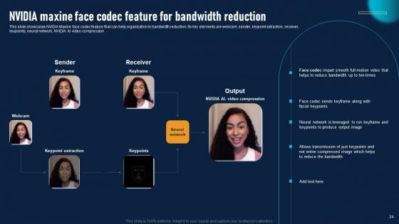 This slide showcases NVIDIA Maxine face codec feature that can help organization in bandwidth reduction. Its key elements are webcam, sender, keypoint extraction, receiver, keypoints, neural network, NVIDIA AI video compression Do you have an important presentation coming up Are you looking for something that will make your presentation stand out from the rest Look no further than NVIDIA Maxine Face Codec NVIDIA AI To Improve Virtual Communication Experience Ideas Pdf. With our professional designs, you can trust that your presentation will pop and make delivering it a smooth process. And with Slidegeeks, you can trust that your presentation will be unique and memorable. So why wait Grab NVIDIA Maxine Face Codec NVIDIA AI To Improve Virtual Communication Experience Ideas Pdf today and make your presentation stand out from the rest This slide showcases NVIDIA Maxine face codec feature that can help organization in bandwidth reduction. Its key elements are webcam, sender, keypoint extraction, receiver, keypoints, neural network, NVIDIA AI video compression