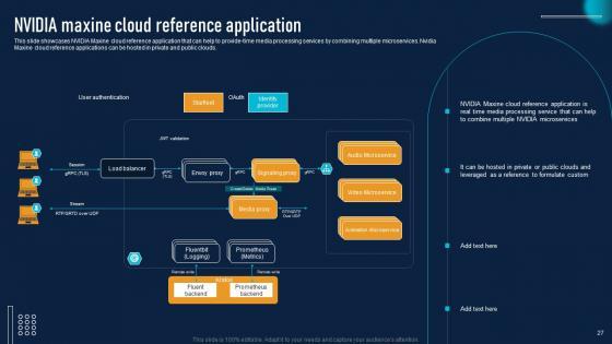 This slide showcases NVIDIA Maxine cloud reference application that can help to provide time media processing services by combining multiple microservices. Nvidia Maxine cloud reference applications can be hosted in private and public clouds. From laying roadmaps to briefing everything in detail, our templates are perfect for you. You can set the stage with your presentation slides. All you have to do is download these easy to edit and customizable templates. NVIDIA Maxine Cloud NVIDIA AI To Improve Virtual Communication Experience Diagrams Pdf will help you deliver an outstanding performance that everyone would remember and praise you for. Do download this presentation today. This slide showcases NVIDIA Maxine cloud reference application that can help to provide time media processing services by combining multiple microservices. Nvidia Maxine cloud reference applications can be hosted in private and public clouds.