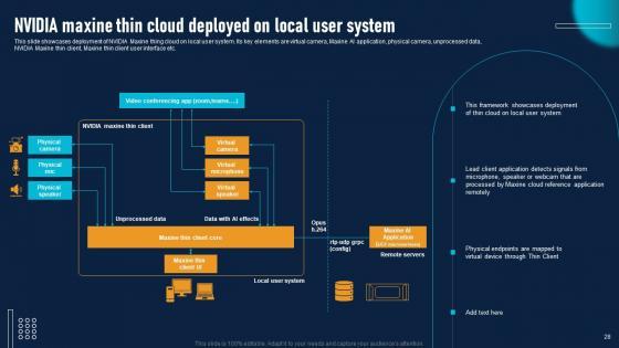 This slide showcases deployment of NVIDIA Maxine thing cloud on local user system. Its key elements are virtual camera, Maxine AI application, physical camera, unprocessed data, NVIDIA Maxine thin client, Maxine thin client user interface etc. Find highly impressive NVIDIA Maxine Thin Cloud NVIDIA AI To Improve Virtual Communication Experience Portrait Pdf on Slidegeeks to deliver a meaningful presentation. You can save an ample amount of time using these presentation templates. No need to worry to prepare everything from scratch because Slidegeeks experts have already done a huge research and work for you. You need to download NVIDIA Maxine Thin Cloud NVIDIA AI To Improve Virtual Communication Experience Portrait Pdf for your upcoming presentation. All the presentation templates are 100 percent editable and you can change the color and personalize the content accordingly. Download now This slide showcases deployment of NVIDIA Maxine thing cloud on local user system. Its key elements are virtual camera, Maxine AI application, physical camera, unprocessed data, NVIDIA Maxine thin client, Maxine thin client user interface etc.