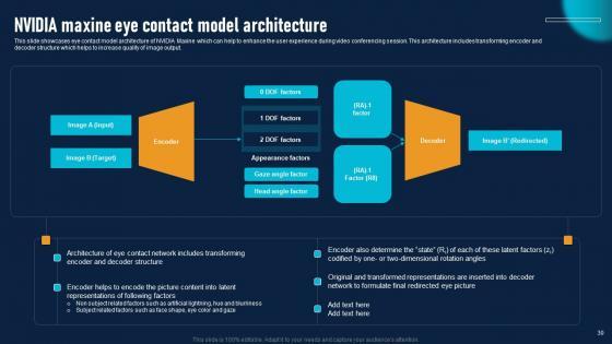 This slide showcases eye contact model architecture of NVIDIA Maxine which can help to enhance the user experience during video conferencing session. This architecture includes transforming encoder and decoder structure which helps to increase quality of image output. Slidegeeks is here to make your presentations a breeze with NVIDIA Maxine Eye NVIDIA AI To Improve Virtual Communication Experience Formats Pdf With our easy to use and customizable templates, you can focus on delivering your ideas rather than worrying about formatting. With a variety of designs to choose from, you are sure to find one that suits your needs. And with animations and unique photos, illustrations, and fonts, you can make your presentation pop. So whether you are giving a sales pitch or presenting to the board, make sure to check out Slidegeeks first This slide showcases eye contact model architecture of NVIDIA Maxine which can help to enhance the user experience during video conferencing session. This architecture includes transforming encoder and decoder structure which helps to increase quality of image output.