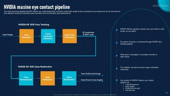 This slide showcases pipeline of NVIDIA Maxine eye contact feature that can help to improve the quality of video and enhance user experience. Its key elements are face detection, head pose estimation, gaze estimation, face normalization, gaze redirection etc. Present like a pro with NVIDIA Maxine Eye Contact NVIDIA AI To Improve Virtual Communication Experience Professional Pdf Create beautiful presentations together with your team, using our easy to use presentation slides. Share your ideas in real time and make changes on the fly by downloading our templates. So whether you are in the office, on the go, or in a remote location, you can stay in sync with your team and present your ideas with confidence. With Slidegeeks presentation got a whole lot easier. Grab these presentations today. This slide showcases pipeline of NVIDIA Maxine eye contact feature that can help to improve the quality of video and enhance user experience. Its key elements are face detection, head pose estimation, gaze estimation, face normalization, gaze redirection etc.