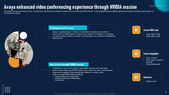 This slide showcase case study of Avaya company that improved video conference experience of users through NVIDIA Maxine. It also highlights Maxine software development kits plus hardware used by Avaya for improving video output Are you searching for a Avaya Enhanced Video NVIDIA AI To Improve Virtual Communication Experience Themes Pdf that is uncluttered, straightforward, and original Its easy to edit, and you can change the colors to suit your personal or business branding. For a presentation that expresses how much effort you have put in, this template is ideal With all of its features, including tables, diagrams, statistics, and lists, its perfect for a business plan presentation. Make your ideas more appealing with these professional slides. Download Avaya Enhanced Video NVIDIA AI To Improve Virtual Communication Experience Themes Pdf from Slidegeeks today. This slide showcase case study of Avaya company that improved video conference experience of users through NVIDIA Maxine. It also highlights Maxine software development kits plus hardware used by Avaya for improving video output