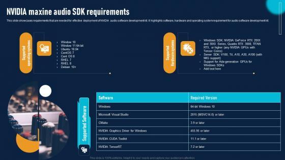 This slide showcases requirements that are needed for effective deployment of NVIDIA audio software development kit. It highlights software, hardware and operating system requirement for audio software development kit. Do you have to make sure that everyone on your team knows about any specific topic I yes, then you should give NVIDIA Maxine Audio SDK NVIDIA AI To Improve Virtual Communication Experience Ideas Pdf a try. Our experts have put a lot of knowledge and effort into creating this impeccable NVIDIA Maxine Audio SDK NVIDIA AI To Improve Virtual Communication Experience Ideas Pdf. You can use this template for your upcoming presentations, as the slides are perfect to represent even the tiniest detail. You can download these templates from the Slidegeeks website and these are easy to edit. So grab these today This slide showcases requirements that are needed for effective deployment of NVIDIA audio software development kit. It highlights software, hardware and operating system requirement for audio software development kit.