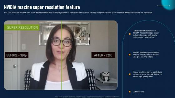 This slide showcase NVIDIA Maxine super resolution feature that can help organization to improve the video output. It can help to improve the video quality and retain details for enhanced user experience. Whether you have daily or monthly meetings, a brilliant presentation is necessary. NVIDIA Maxine Super NVIDIA AI To Improve Virtual Communication Experience Guidelines Pdf can be your best option for delivering a presentation. Represent everything in detail using NVIDIA Maxine Super NVIDIA AI To Improve Virtual Communication Experience Guidelines Pdf and make yourself stand out in meetings. The template is versatile and follows a structure that will cater to your requirements. All the templates prepared by Slidegeeks are easy to download and edit. Our research experts have taken care of the corporate themes as well. So, give it a try and see the results. This slide showcase NVIDIA Maxine super resolution feature that can help organization to improve the video output. It can help to improve the video quality and retain details for enhanced user experience.