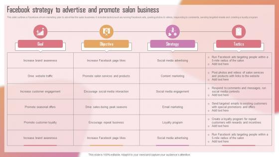 This slide outlines a Facebook-driven marketing plan to advertise the salon business. It includes tactics such as running Facebook ads, posting photos and videos, responding to comments, sending targeted emails and creating a loyalty program. The best PPT templates are a great way to save time, energy, and resources. Slidegeeks have 100 percent editable powerpoint slides making them incredibly versatile. With these quality presentation templates, you can create a captivating and memorable presentation by combining visually appealing slides and effectively communicating your message. Download Customizing The Salon Experience Facebook Strategy To Advertise And Promote Salon Business Strategy SS V from Slidegeeks and deliver a wonderful presentation. This slide outlines a Facebook-driven marketing plan to advertise the salon business. It includes tactics such as running Facebook ads, posting photos and videos, responding to comments, sending targeted emails and creating a loyalty program.
