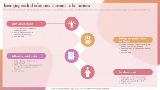 This slide presents key strategies to effectively collaborate with online influencers. It includes tactics such as identify relevant influencer, collaborate for content creation, host influencer events and encourage user generated content from followers. Slidegeeks is one of the best resources for PowerPoint templates. You can download easily and regulate Customizing The Salon Experience Leveraging Reach Of Influencers To Promote Salon Business Strategy SS V for your personal presentations from our wonderful collection. A few clicks is all it takes to discover and get the most relevant and appropriate templates. Use our Templates to add a unique zing and appeal to your presentation and meetings. All the slides are easy to edit and you can use them even for advertisement purposes. This slide presents key strategies to effectively collaborate with online influencers. It includes tactics such as identify relevant influencer, collaborate for content creation, host influencer events and encourage user generated content from followers.
