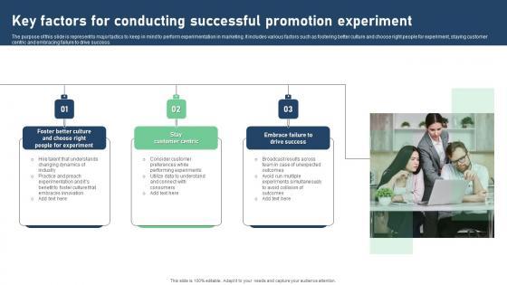 The purpose of this slide is represent to major tactics to keep in mind to perform experimentation in marketing. It includes various factors such as fostering better culture and choose right people for experiment, staying customer centric and embracing failure to drive success. Showcasing this set of slides titled Key Factors For Conducting Successful Promotion Experiment Portrait Pdf. The topics addressed in these templates are Conducting Successful, Promotion Experiment, Customer Centric, Perform Experimentation. All the content presented in this PPT design is completely editable. Download it and make adjustments in color, background, font etc. as per your unique business setting. The purpose of this slide is represent to major tactics to keep in mind to perform experimentation in marketing. It includes various factors such as fostering better culture and choose right people for experiment, staying customer centric and embracing failure to drive success.