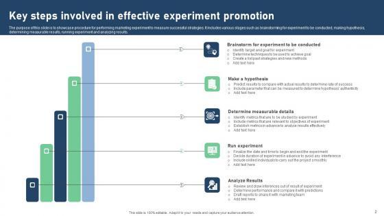 The purpose of this slide is to showcase procedure for performing marketing experiment to measure successful strategies. It includes various stages such as brainstorming for experiment to be conducted, making hypothesis, determining measurable results, running experiment and analyzing results. Pitch your topic with ease and precision using this Key Steps Involved In Effective Experiment Promotion Summary Pdf. This layout presents information on Run Experiment, Effective Experiment Promotion, Analyze Results. It is also available for immediate download and adjustment. So, changes can be made in the color, design, graphics or any other component to create a unique layout. The purpose of this slide is to showcase procedure for performing marketing experiment to measure successful strategies. It includes various stages such as brainstorming for experiment to be conducted, making hypothesis, determining measurable results, running experiment and analyzing results.