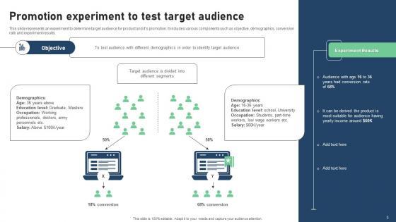 This slide represents an experiment to determine target audience for product and its promotion. It includes various components such as objective, demographics, conversion rate and experiment results. Showcasing this set of slides titled Promotion Experiment To Test Target Audience Designs Pdf. The topics addressed in these templates are Promotion Experiment, Test Target Audience, Demographics, Conversion Rate. All the content presented in this PPT design is completely editable. Download it and make adjustments in color, background, font etc. as per your unique business setting. This slide represents an experiment to determine target audience for product and its promotion. It includes various components such as objective, demographics, conversion rate and experiment results.