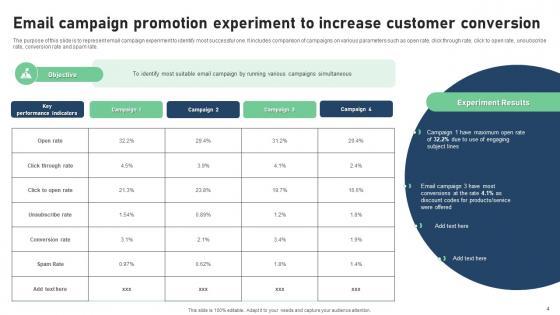 The purpose of this slide is to represent email campaign experiment to identify most successful one. It includes comparison of campaigns on various parameters such as open rate, click through rate, click to open rate, unsubscribe rate, conversion rate and spam rate. Pitch your topic with ease and precision using this Email Campaign Promotion Experiment To Increase Customer Conversion Infographics Pdf. This layout presents information on Email Campaign, Promotion Experiment, Increase Customer Conversion. It is also available for immediate download and adjustment. So, changes can be made in the color, design, graphics or any other component to create a unique layout. The purpose of this slide is to represent email campaign experiment to identify most successful one. It includes comparison of campaigns on various parameters such as open rate, click through rate, click to open rate, unsubscribe rate, conversion rate and spam rate.