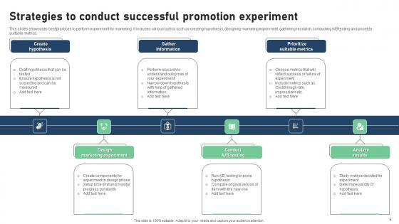 This slides showcases best practices to perform experiment for marketing. It includes various tactics such as creating hypothesis, designing marketing experiment, gathering research, conducting A or B testing and prioritize suitable metrics. Showcasing this set of slides titled Strategies To Conduct Successful Promotion Experiment Themes Pdf. The topics addressed in these templates are Prioritize Suitable Metrics, Strategies, Promotion Experiment. All the content presented in this PPT design is completely editable. Download it and make adjustments in color, background, font etc. as per your unique business setting. This slides showcases best practices to perform experiment for marketing. It includes various tactics such as creating hypothesis, designing marketing experiment, gathering research, conducting A or B testing and prioritize suitable metrics.