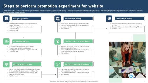 The purpose of this slide is to represent stages involved in performing landing page or website testing. It includes various steps such as designing hypothesis, determining targets, choosing an item to test, performing A or A testing, deciding duration of experiment etc. Pitch your topic with ease and precision using this Steps To Perform Promotion Experiment For Website Mockup Pdf. This layout presents information on Decide Duration Of Experiment, Determine Targets, Design Hypothesis. It is also available for immediate download and adjustment. So, changes can be made in the color, design, graphics or any other component to create a unique layout. The purpose of this slide is to represent stages involved in performing landing page or website testing. It includes various steps such as designing hypothesis, determining targets, choosing an item to test, performing A or A testing, deciding duration of experiment etc.
