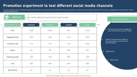 The purpose of this slide is to represent an experiment to determine most suitable social media platform for promoting product. It includes various parameters of experiment such as likes, engagement rate, conversion rate, shares, followers growth and cost. Pitch your topic with ease and precision using this Promotion Experiment To Test Different Social Media Channels Rules Pdf. This layout presents information on Promotion Experiment, Social Media Channels, Conversion Rate. It is also available for immediate download and adjustment. So, changes can be made in the color, design, graphics or any other component to create a unique layout. The purpose of this slide is to represent an experiment to determine most suitable social media platform for promoting product. It includes various parameters of experiment such as likes, engagement rate, conversion rate, shares, followers growth and cost.