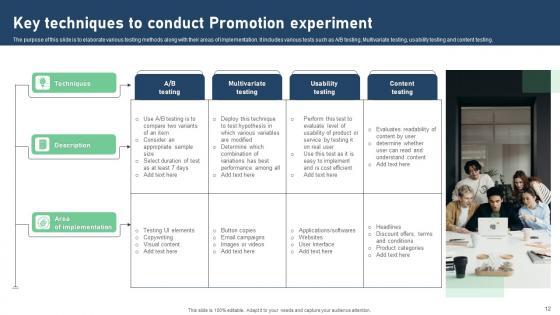 The purpose of this slide is to elaborate various testing methods along with their areas of implementation. It includes various tests such as A or B testing, Multivariate testing, usability testing and content testing. Showcasing this set of slides titled Key Techniques To Conduct Promotion Experiment Information Pdf. The topics addressed in these templates are Key Techniques, Conduct Promotion Experiment, Multivariate Testing. All the content presented in this PPT design is completely editable. Download it and make adjustments in color, background, font etc. as per your unique business setting. The purpose of this slide is to elaborate various testing methods along with their areas of implementation. It includes various tests such as A or B testing, Multivariate testing, usability testing and content testing.