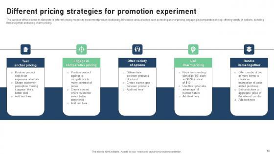 The purpose of this slide is to elaborate is different pricing models to experiment product positioning. It includes various tactics such as testing anchor pricing, engaging in comparative pricing, offering variety of options, bundling items together and using charm pricing. Showcasing this set of slides titled Different Pricing Strategies For Promotion Experiment Professional Pdf. The topics addressed in these templates are Test Anchor Pricing, Engage In Comparative Pricing, Promotion Experiment. All the content presented in this PPT design is completely editable. Download it and make adjustments in color, background, font etc. as per your unique business setting. The purpose of this slide is to elaborate is different pricing models to experiment product positioning. It includes various tactics such as testing anchor pricing, engaging in comparative pricing, offering variety of options, bundling items together and using charm pricing.