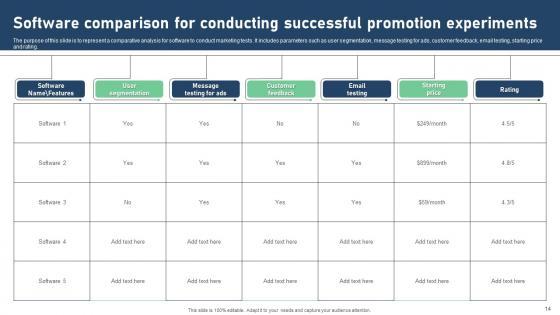 The purpose of this slide is to represent a comparative analysis for software to conduct marketing tests. It includes parameters such as user segmentation, message testing for ads, customer feedback, email testing, starting price and rating. Pitch your topic with ease and precision using this Software Comparison For Conducting Successful Promotion Experiments Sample Pdf. This layout presents information on Software Comparison, Promotion Experiments, Starting Price And Rating, Email Testing. It is also available for immediate download and adjustment. So, changes can be made in the color, design, graphics or any other component to create a unique layout. The purpose of this slide is to represent a comparative analysis for software to conduct marketing tests. It includes parameters such as user segmentation, message testing for ads, customer feedback, email testing, starting price and rating.