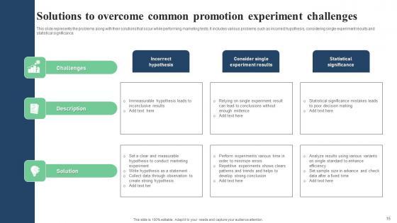 This slide represents the problems along with their solutions that occur while performing marketing tests. It includes various problems such as incorrect hypothesis, considering single experiment results and statistical significance. Showcasing this set of slides titled Solutions To Overcome Common Promotion Experiment Challenges Sample Pdf. The topics addressed in these templates are Promotion Experiment Challenges, Incorrect Hypothesis, Statistical Significance. All the content presented in this PPT design is completely editable. Download it and make adjustments in color, background, font etc. as per your unique business setting. This slide represents the problems along with their solutions that occur while performing marketing tests. It includes various problems such as incorrect hypothesis, considering single experiment results and statistical significance.