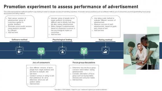 This slide represents the method to perform copy testing in order to evaluate success of marketing objectives. It includes various practices such as software method, jury of consumers, psychological testing, focus group discussions and rating method. Pitch your topic with ease and precision using this Promotion Experiment To Assess Performance Of Advertisement Designs Pdf. This layout presents information on Psychological Testing, Focus Group Discussions, Jury Of Consumers. It is also available for immediate download and adjustment. So, changes can be made in the color, design, graphics or any other component to create a unique layout. This slide represents the method to perform copy testing in order to evaluate success of marketing objectives. It includes various practices such as software method, jury of consumers, psychological testing, focus group discussions and rating method.
