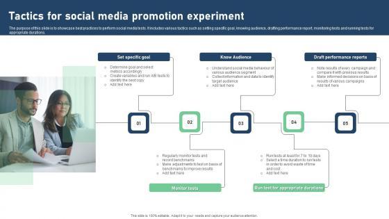 The purpose of this slide is to showcase best practices to perform social media tests. It includes various tactics such as setting specific goal, knowing audience, drafting performance report, monitoring tests and running tests for appropriate durations. Pitch your topic with ease and precision using this Tactics For Social Media Promotion Experiment Icons Pdf. This layout presents information on Tactics For Social Media, Promotion Experiment, Appropriate Durations, Performance Report. It is also available for immediate download and adjustment. So, changes can be made in the color, design, graphics or any other component to create a unique layout. The purpose of this slide is to showcase best practices to perform social media tests. It includes various tactics such as setting specific goal, knowing audience, drafting performance report, monitoring tests and running tests for appropriate durations.