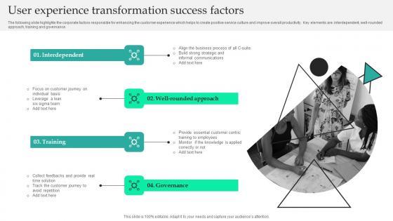 The following slide highlights the corporate factors responsible for enhancing the customer experience which helps to create positive service culture and improve overall productivity. Key elements are interdependent, well-rounded approach, training and governance. Showcasing this set of slides titled User Experience Transformation Success Factors Download Pdf. The topics addressed in these templates are Interdependent, Training, Governance. All the content presented in this PPT design is completely editable. Download it and make adjustments in color, background, font etc. as per your unique business setting. The following slide highlights the corporate factors responsible for enhancing the customer experience which helps to create positive service culture and improve overall productivity. Key elements are interdependent, well-rounded approach, training and governance.