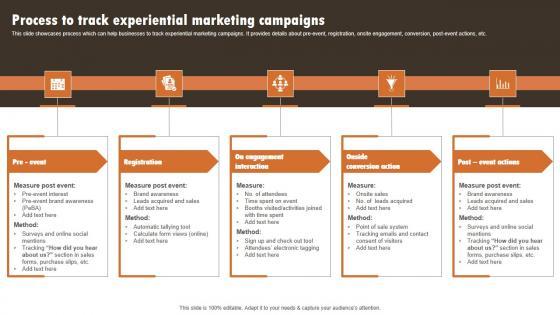 This slide showcases process which can help businesses to track experiential marketing campaigns. It provides details about pre-event, registration, onsite engagement, conversion, post-event actions, etc. Boost your pitch with our creative Process To Track Experiential Marketing Campaigns Experiential Marketing Technique Portrait PDF. Deliver an awe-inspiring pitch that will mesmerize everyone. Using these presentation templates you will surely catch everyones attention. You can browse the ppts collection on our website. We have researchers who are experts at creating the right content for the templates. So you do not have to invest time in any additional work. Just grab the template now and use them. This slide showcases process which can help businesses to track experiential marketing campaigns. It provides details about pre-event, registration, onsite engagement, conversion, post-event actions, etc.