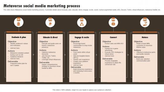 This slide shows Metaverse social media marketing process. It provides details about evaluate, plan, educate, direct, engage, excite, covert, nurture augmented reality AR, Discord, Twitch, virtual influencers, metaverse footfall, etc. Get a simple yet stunning designed Metaverse Social Media Marketing Process Experiential Marketing Technique Introduction PDF. It is the best one to establish the tone in your meetings. It is an excellent way to make your presentations highly effective. So, download this PPT today from Slidegeeks and see the positive impacts. Our easy-to-edit Metaverse Social Media Marketing Process Experiential Marketing Technique Introduction PDF can be your go-to option for all upcoming conferences and meetings. So, what are you waiting for Grab this template today. This slide shows Metaverse social media marketing process. It provides details about evaluate, plan, educate, direct, engage, excite, covert, nurture augmented reality AR, Discord, Twitch, virtual influencers, metaverse footfall, etc.