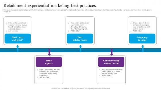 This slide showcases retail entertainment Retailnment experiential marketing best practices for retail outlets. It provides details about meet and greet, invite experts, host holiday events, conduct friend invite events, pop in shops, etc. Presenting this PowerPoint presentation, titled Retailnment Experiential Marketing Centric Marketing To Enhance Brand Connections Introduction Pdf, with topics curated by our researchers after extensive research. This editable presentation is available for immediate download and provides attractive features when used. Download now and captivate your audience. Presenting this Retailnment Experiential Marketing Centric Marketing To Enhance Brand Connections Introduction Pdf. Our researchers have carefully researched and created these slides with all aspects taken into consideration. This is a completely customizable Retailnment Experiential Marketing Centric Marketing To Enhance Brand Connections Introduction Pdf that is available for immediate downloading. Download now and make an impact on your audience. Highlight the attractive features available with our PPTs. This slide showcases retail entertainment Retailnment experiential marketing best practices for retail outlets. It provides details about meet and greet, invite experts, host holiday events, conduct friend invite events, pop in shops, etc.