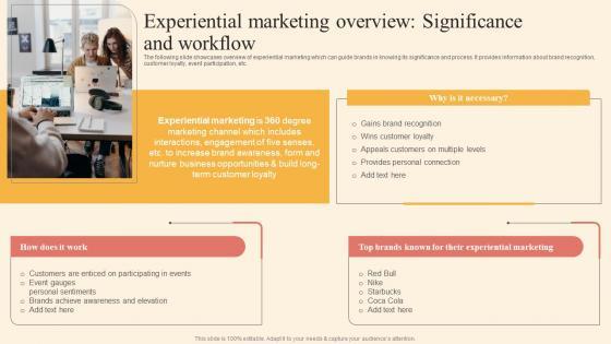 The following slide showcases overview of experiential marketing which can guide brands in knowing its significance and process. It provides information about brand recognition, customer loyalty, event participation, etc. Slidegeeks is here to make your presentations a breeze with Experiential Marketing Overview Significance And Workflow Template PDF With our easy to use and customizable templates, you can focus on delivering your ideas rather than worrying about formatting. With a variety of designs to choose from, you are sure to find one that suits your needs. And with animations and unique photos, illustrations, and fonts, you can make your presentation pop. So whether you are giving a sales pitch or presenting to the board, make sure to check out Slidegeeks first.