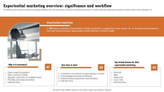The following slide showcases overview of experiential marketing which can guide brands in knowing its significance and process. It provides information about brand recognition, customer loyalty, event participation, etc.The best PPT templates are a great way to save time, energy, and resources. Slidegeeks have 100precent editable powerpoint slides making them incredibly versatile. With these quality presentation templates, you can create a captivating and memorable presentation by combining visually appealing slides and effectively communicating your message. Download Implementing Experimental Marketing Experiential Marketing Overview Significance And Workflow Template PDF from Slidegeeks and deliver a wonderful presentation.
