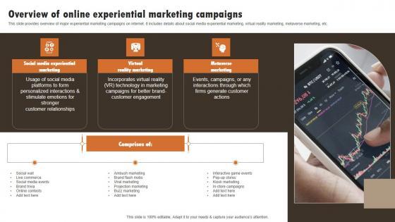 This slide provides overview of major experiential marketing campaigns on internet. It includes details about social media experiential marketing, virtual reality marketing, metaverse marketing, etc.Slidegeeks is here to make your presentations a breeze with Implementing Experimental Marketing Overview Of Online Experiential Marketing Campaigns Sample PDF With our easy-to-use and customizable templates, you can focus on delivering your ideas rather than worrying about formatting. With a variety of designs to choose from, you are sure to find one that suits your needs. And with animations and unique photos, illustrations, and fonts, you can make your presentation pop. So whether you are giving a sales pitch or presenting to the board, make sure to check out Slidegeeks first.