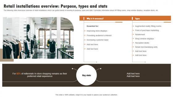 The following slide showcases overview of retail installations which can guide brands in knowing its purpose, types and stats. It provides information about AR fitting rooms, shop window displays, reception desks, etc. Slidegeeks is one of the best resources for PowerPoint templates. You can download easily and regulate Retail Installations Overview Purpose Types Experiential Marketing Technique Professional PDF for your personal presentations from our wonderful collection. A few clicks is all it takes to discover and get the most relevant and appropriate templates. Use our Templates to add a unique zing and appeal to your presentation and meetings. All the slides are easy to edit and you can use them even for advertisement purposes. The following slide showcases overview of retail installations which can guide brands in knowing its purpose, types and stats. It provides information about AR fitting rooms, shop window displays, reception desks, etc.