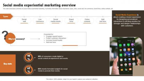 This slide showcases overview of social media experiential marketing. It provides information about importance, types, stats, social wall, live commerce, brand trivia, online contests, etc. From laying roadmaps to briefing everything in detail, our templates are perfect for you. You can set the stage with your presentation slides. All you have to do is download these easy-to-edit and customizable templates. Social Media Experiential Marketing Overview Experiential Marketing Technique Designs PDF will help you deliver an outstanding performance that everyone would remember and praise you for. Do download this presentation today. This slide showcases overview of social media experiential marketing. It provides information about importance, types, stats, social wall, live commerce, brand trivia, online contests, etc.