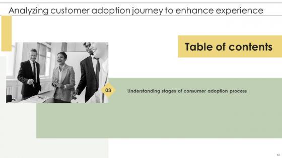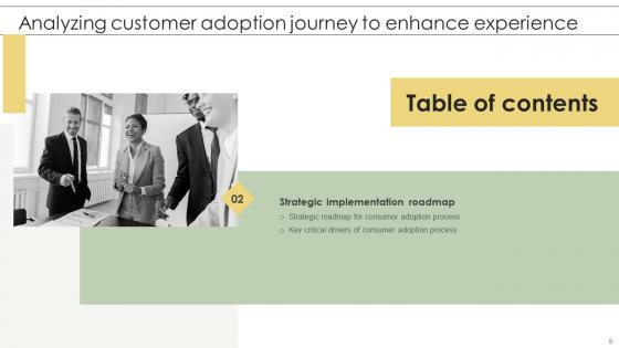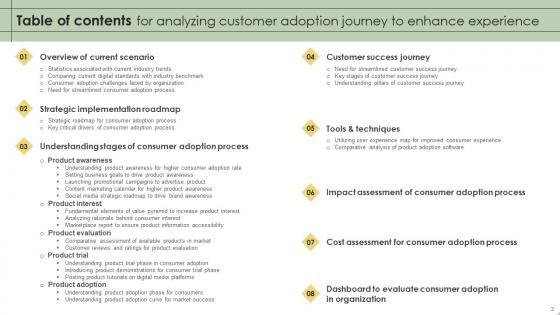 Boost your pitch with our creative Analyzing Customer Adoption Journey To Enhance Experience Table Of Content Elements Pdf. Deliver an awe-inspiring pitch that will mesmerize everyone. Using these presentation templates you will surely catch everyones attention. You can browse the ppts collection on our website. We have researchers who are experts at creating the right content for the templates. So you do not have to invest time in any additional work. Just grab the template now and use them. Our Analyzing Customer Adoption Journey To Enhance Experience Table Of Content Elements Pdf are topically designed to provide an attractive backdrop to any subject. Use them to look like a presentation pro.