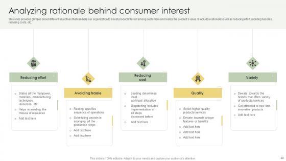 This slide provides glimpse about different objectives that can help our organization to boost product interest among customers and realize the products value. It includes rationales such as reducing effort, avoiding hassles, reducing costs, etc. Boost your pitch with our creative Examining Customer Experience Path To Enhance Adoption Rate Analyzing Rationale Behind Consumer Elements PDF. Deliver an awe-inspiring pitch that will mesmerize everyone. Using these presentation templates you will surely catch everyones attention. You can browse the ppts collection on our website. We have researchers who are experts at creating the right content for the templates. So you do not have to invest time in any additional work. Just grab the template now and use them.