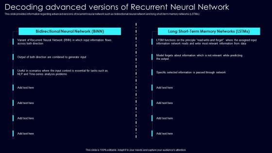 This slide provides information regarding advanced versions of recurrent neural network such as bidirectional neural network and long short term memory networks LSTMs. If you are looking for a format to display your unique thoughts, then the professionally designed Decoding Advanced Versions Exploring Rise Of Generative AI In Artificial Intelligence Download Pdf is the one for you. You can use it as a Google Slides template or a PowerPoint template. Incorporate impressive visuals, symbols, images, and other charts. Modify or reorganize the text boxes as you desire. Experiment with shade schemes and font pairings. Alter, share or cooperate with other people on your work. Download Decoding Advanced Versions Exploring Rise Of Generative AI In Artificial Intelligence Download Pdf and find out how to give a successful presentation. Present a perfect display to your team and make your presentation unforgettable. This slide provides information regarding advanced versions of recurrent neural network such as bidirectional neural network and long short term memory networks LSTMs.