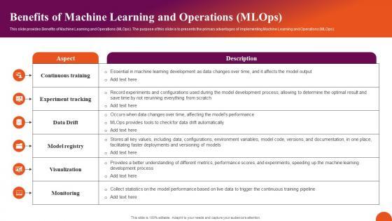 This slide provides Benefits of Machine Learning and Operations MLOps. The purpose of this slide is to presents the primary advantages of implementing Machine Learning and Operations MLOps. Retrieve professionally designed Benefits Of Machine Learning And Operations Exploring Machine Learning Operations Elements Pdf to effectively convey your message and captivate your listeners. Save time by selecting pre made slideshows that are appropriate for various topics, from business to educational purposes. These themes come in many different styles, from creative to corporate, and all of them are easily adjustable and can be edited quickly. Access them as PowerPoint templates or as Google Slides themes. You do not have to go on a hunt for the perfect presentation because Slidegeeks got you covered from everywhere. This slide provides Benefits of Machine Learning and Operations MLOps. The purpose of this slide is to presents the primary advantages of implementing Machine Learning and Operations MLOps.