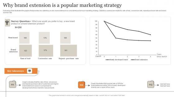 Following slide illustrates the graphs that provides key statistics on why brand extension is considered as famous marketing strategy. Statistics covered are related to rate of trial, conversion rate, repeat purchase rate and brand survival rate. If your project calls for a presentation, then Slidegeeks is your go-to partner because we have professionally designed, easy-to-edit templates that are perfect for any presentation. After downloading, you can easily edit Tactical Brand Extension Launching Why Brand Extension Is A Popular Marketing Strategy Template PDF and make the changes accordingly. You can rearrange slides or fill them with different images. Check out all the handy templates.