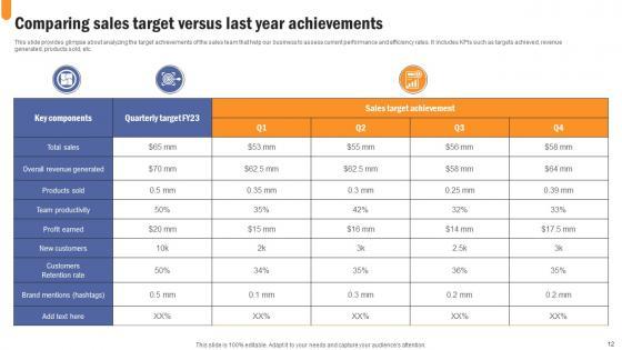 This slide provides glimpse about analyzing the target achievements of the sales team that help our business to assess current performance and efficiency rates. It includes KPIs such as targets achieved, revenue generated, products sold, etc. Slidegeeks is here to make your presentations a breeze with Comparing Sales Target Developing Extensive Sales And Operations Strategy Ideas Pdf With our easy to use and customizable templates, you can focus on delivering your ideas rather than worrying about formatting. With a variety of designs to choose from, you are sure to find one that suits your needs. And with animations and unique photos, illustrations, and fonts, you can make your presentation pop. So whether you are giving a sales pitch or presenting to the board, make sure to check out Slidegeeks first. This slide provides glimpse about analyzing the target achievements of the sales team that help our business to assess current performance and efficiency rates. It includes KPIs such as targets achieved, revenue generated, products sold, etc.