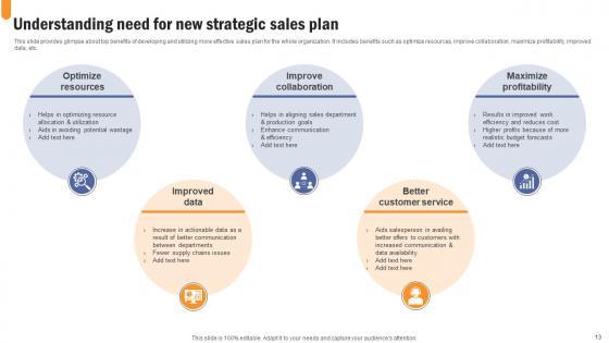 This slide provides glimpse about top benefits of developing and utilizing more effective sales plan for the whole organization. It includes benefits such as optimize resources, improve collaboration, maximize profitability, improved data, etc. From laying roadmaps to briefing everything in detail, our templates are perfect for you. You can set the stage with your presentation slides. All you have to do is download these easy to edit and customizable templates. Understanding Need For New Strategic Developing Extensive Sales And Operations Strategy Sample Pdf will help you deliver an outstanding performance that everyone would remember and praise you for. Do download this presentation today. This slide provides glimpse about top benefits of developing and utilizing more effective sales plan for the whole organization. It includes benefits such as optimize resources, improve collaboration, maximize profitability, improved data, etc.
