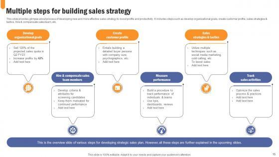 This slide provides glimpse about process of developing new and more effective sales strategy to boost profits and productivity. It includes steps such as develop organizational goals, create customer profile, sales strategies and tactics, hire and compensate sales team, etc. The Multiple Steps For Building Sales Developing Extensive Sales And Operations Strategy Designs Pdf is a compilation of the most recent design trends as a series of slides. It is suitable for any subject or industry presentation, containing attractive visuals and photo spots for businesses to clearly express their messages. This template contains a variety of slides for the user to input data, such as structures to contrast two elements, bullet points, and slides for written information. Slidegeeks is prepared to create an impression. This slide provides glimpse about process of developing new and more effective sales strategy to boost profits and productivity. It includes steps such as develop organizational goals, create customer profile, sales strategies and tactics, hire and compensate sales team, etc.