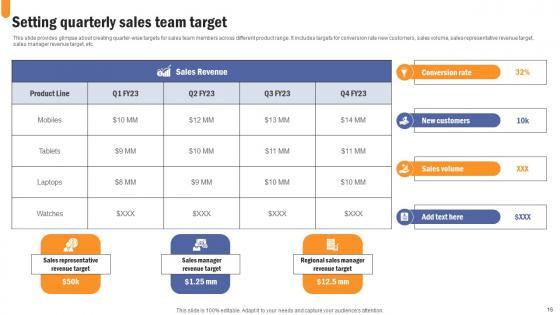 This slide provides glimpse about creating quarter-wise targets for sales team members across different product range. It includes targets for conversion rate new customers, sales volume, sales representative revenue target, sales manager revenue target, etc. Take your projects to the next level with our ultimate collection of Setting Quarterly Sales Team Target Developing Extensive Sales And Operations Strategy Structure Pdf. Slidegeeks has designed a range of layouts that are perfect for representing task or activity duration, keeping track of all your deadlines at a glance. Tailor these designs to your exact needs and give them a truly corporate look with your own brand colors they will make your projects stand out from the rest. This slide provides glimpse about creating quarter-wise targets for sales team members across different product range. It includes targets for conversion rate new customers, sales volume, sales representative revenue target, sales manager revenue target, etc.