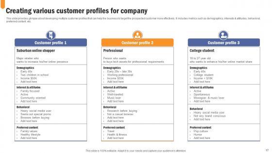 This slide provides glimpse about developing multiple customer profiles that can help the business to target the prospected customer more effectively. It includes metrics such as demographics, interests and attitudes, behavioral, preferred content, etc. Find highly impressive Creating Various Customer Profiles Developing Extensive Sales And Operations Strategy Pictures Pdf on Slidegeeks to deliver a meaningful presentation. You can save an ample amount of time using these presentation templates. No need to worry to prepare everything from scratch because Slidegeeks experts have already done a huge research and work for you. You need to download Creating Various Customer Profiles Developing Extensive Sales And Operations Strategy Pictures Pdf for your upcoming presentation. All the presentation templates are 100 percent editable and you can change the color and personalize the content accordingly. Download now. This slide provides glimpse about developing multiple customer profiles that can help the business to target the prospected customer more effectively. It includes metrics such as demographics, interests and attitudes, behavioral, preferred content, etc.