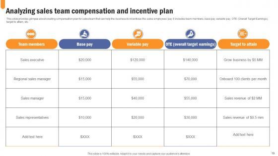 This slide provides glimpse about creating compensation plan for sales team that can help the business to incentivize the sales employees pay. It includes team members, base pay, variable pay, OTE Overall Target Earnings, target to attain, etc. There are so many reasons you need a Analyzing Sales Team Developing Extensive Sales And Operations Strategy Brochure Pdf. The first reason is you can not spend time making everything from scratch, Thus, Slidegeeks has made presentation templates for you too. You can easily download these templates from our website easily. This slide provides glimpse about creating compensation plan for sales team that can help the business to incentivize the sales employees pay. It includes team members, base pay, variable pay, OTE Overall Target Earnings, target to attain, etc.
